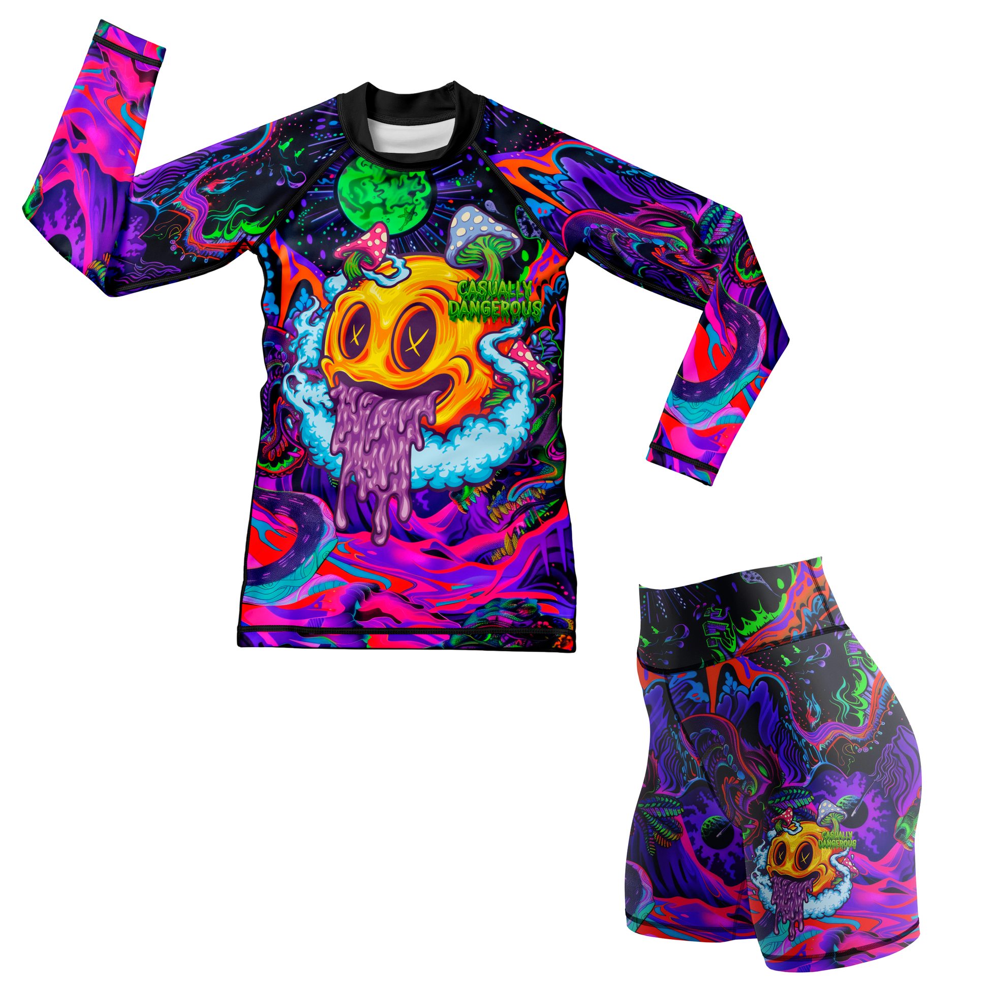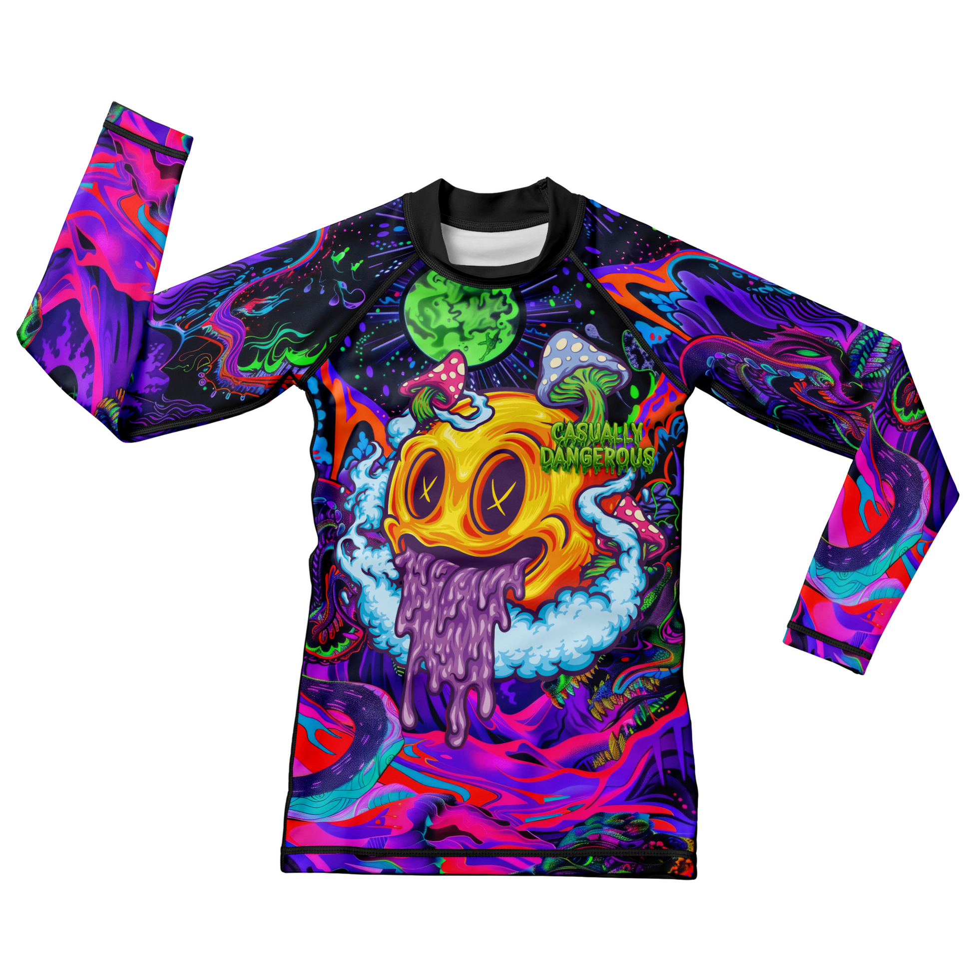 Let your little grappler roll with wild energy in the Casually Dangerous Kid’s BJJ Rash Guard, built for the fearless and the fun. Featuring an electric, psychedelic design with a melting smiley and chaotic space vibes, this jiu jitsu rash guard is made from sweat-wicking, stretchy fabric to keep kids cool, dry, and comfortable during every roll. The compression fit supports growing muscles and movement, while flatlock seams prevent irritation during high-paced training. Perfect for kids who train hard, smile big, and never play it safe—because being dangerous never looked this fun.