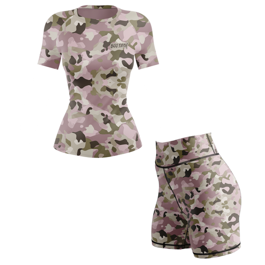 Camiseta de protección contra erupciones de BJJ para mujer en color rosa con camuflaje de combate